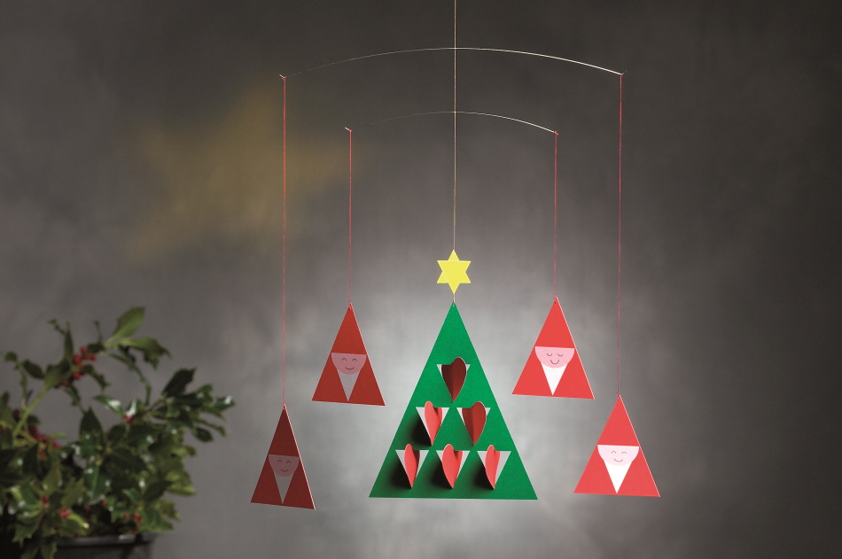 모던함과 클래식한 삼각형이 트리와 산타의 위트있는 캐릭터와 어우러진 <Prismas Mobile> 모빌입니다.