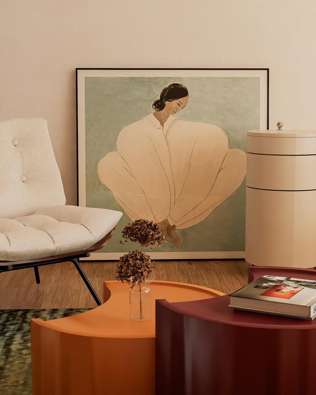 그녀의 온화한 표정과 부드러운 색감은 고요하지만 따뜻한 분위기를 연출하며 넓고 부드러운 실루엣의 옷은 인물을 감싸 안으며, 보호 받는 듯한 느낌이 듭니다.