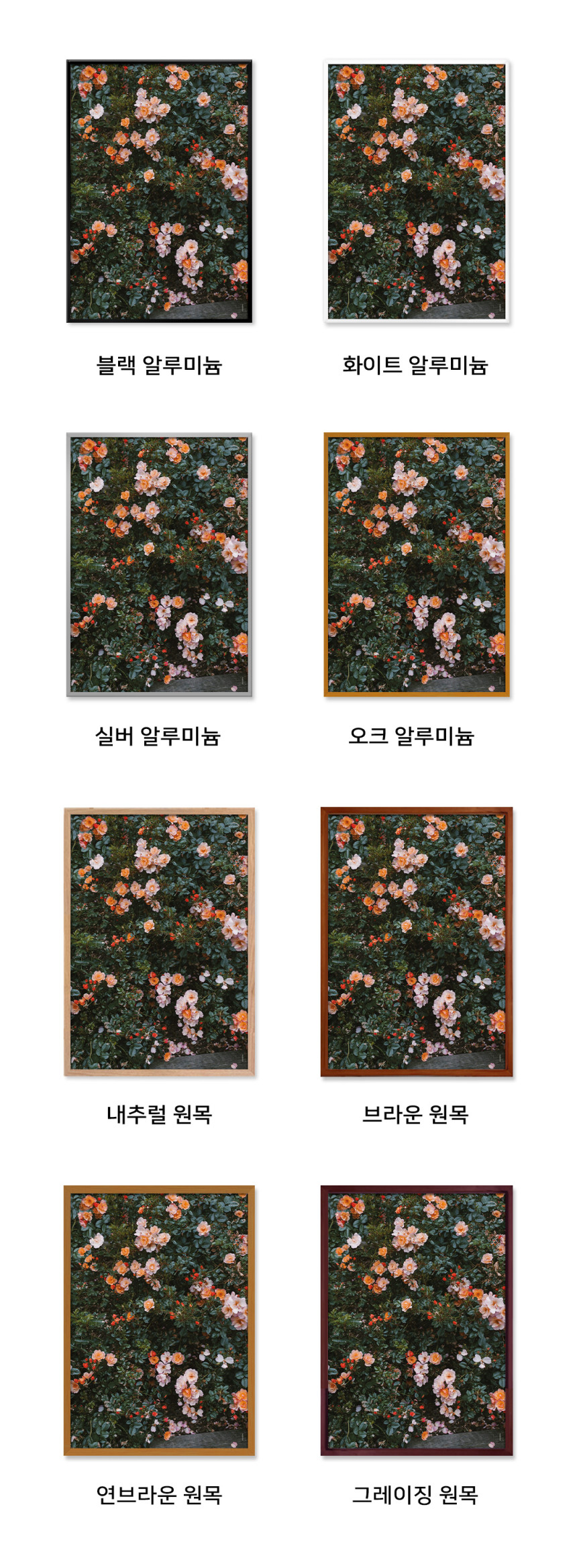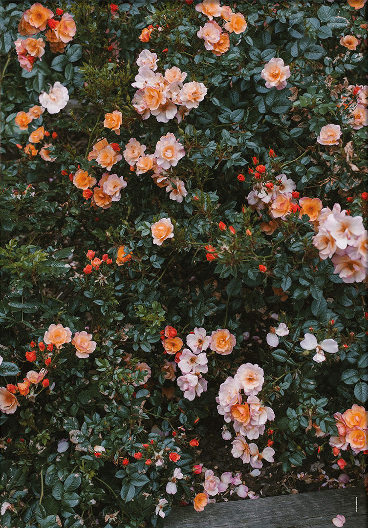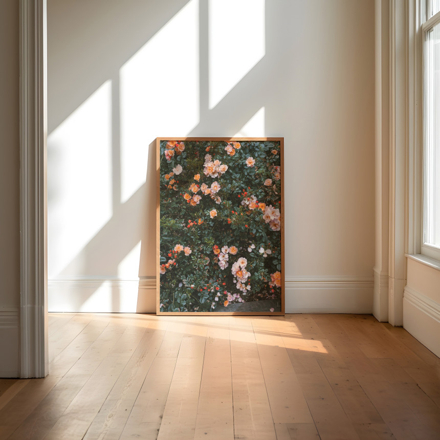 겹겹이 피어난 장미와 짙은 녹음이 화면을 가득 채우며 자연이 만들어낸 풍성함이 돋보이는 사진입니다. 다양한 톤의 오렌지와 피치 컬러가 어우러지며 따뜻한 온도를 형성하고 그 사이로 스며드는 깊은 그린이 전체를 안정감 있게 받쳐줍니다. 특정한 한 송이를 강조하기보다 자연스럽게 얽힌 꽃과 잎의 흐름을 담아내며 시선이 천천히 머무는 장면을 완성합니다. 공간에 생기와 따뜻한 분위기를 더해주는 감각적인 자연 사진입니다.