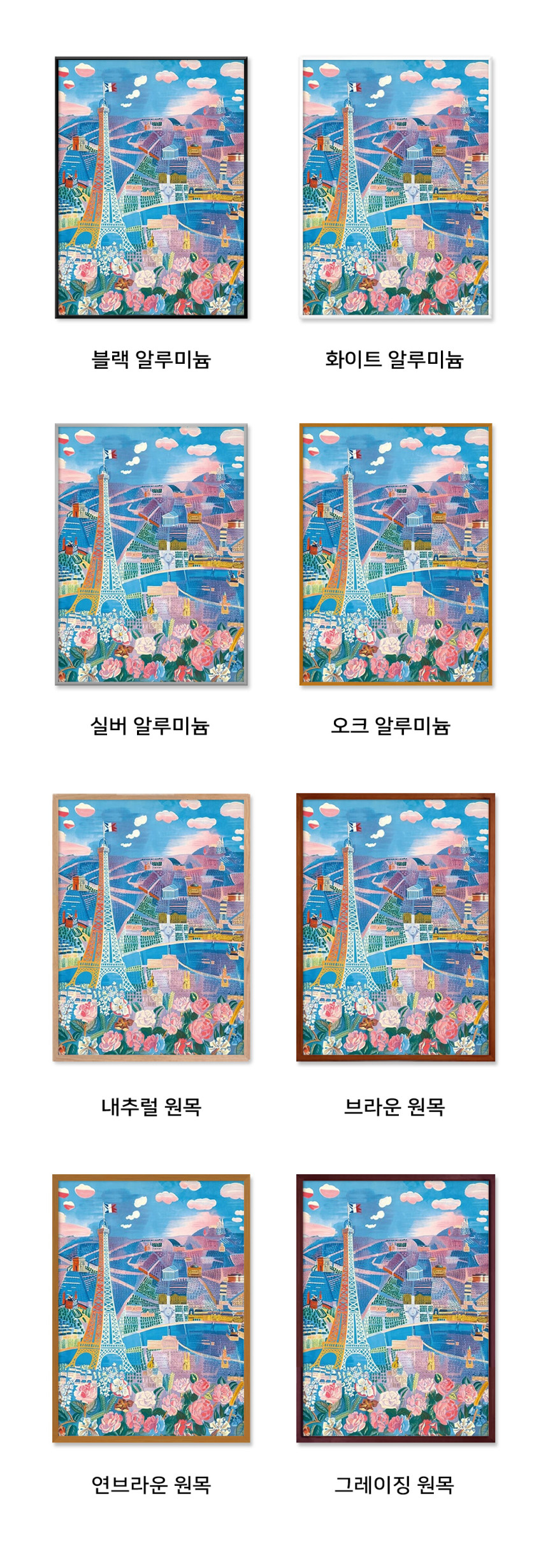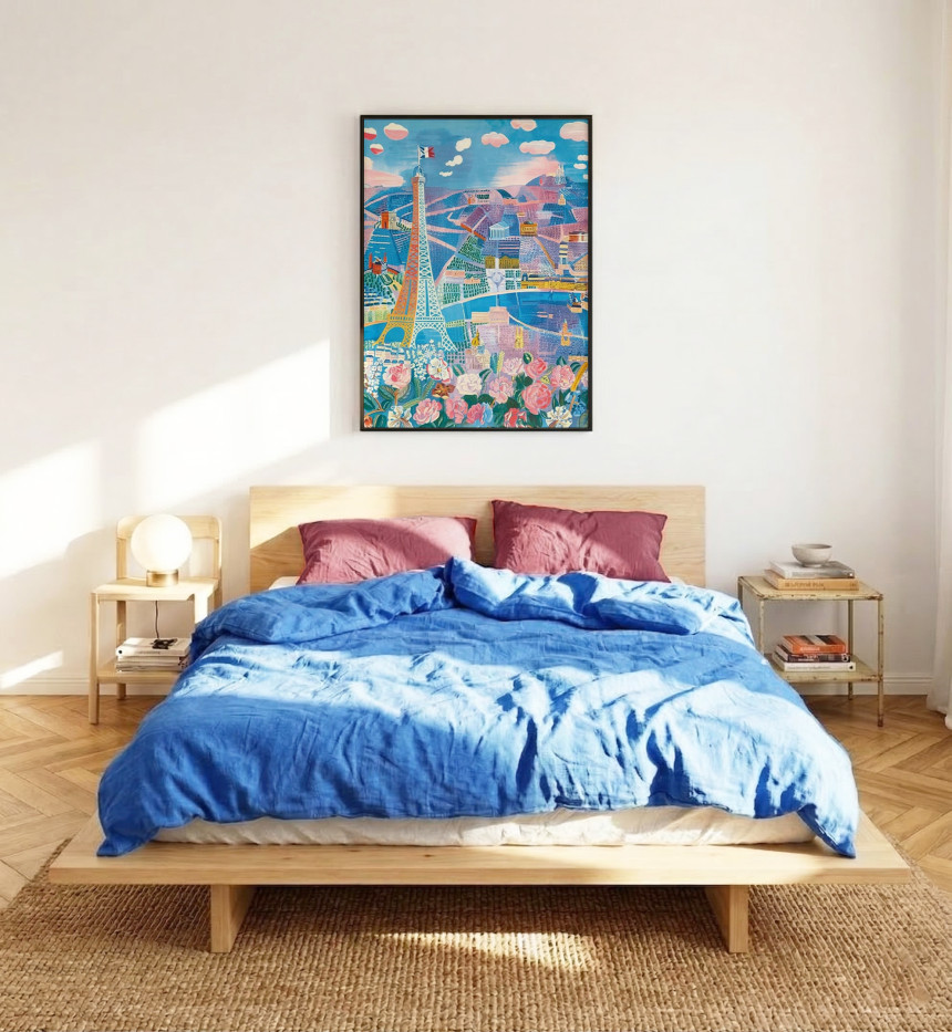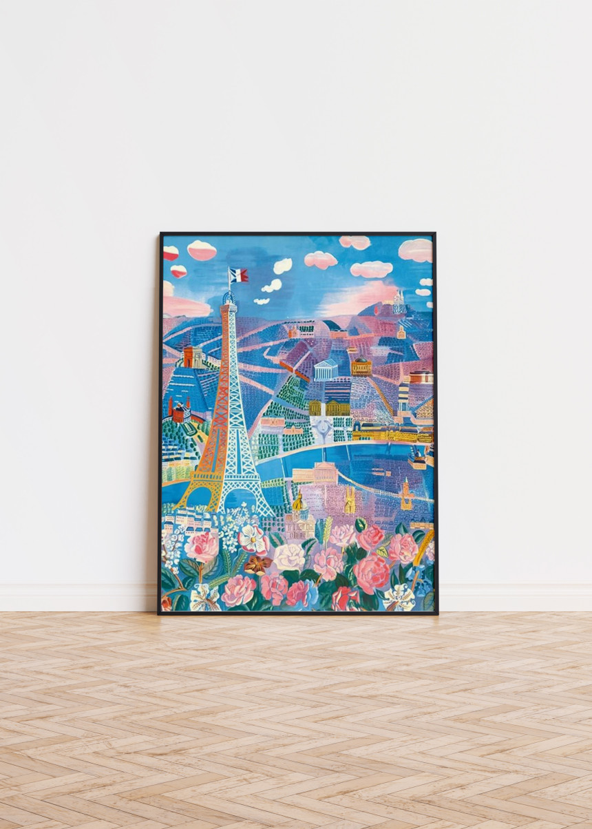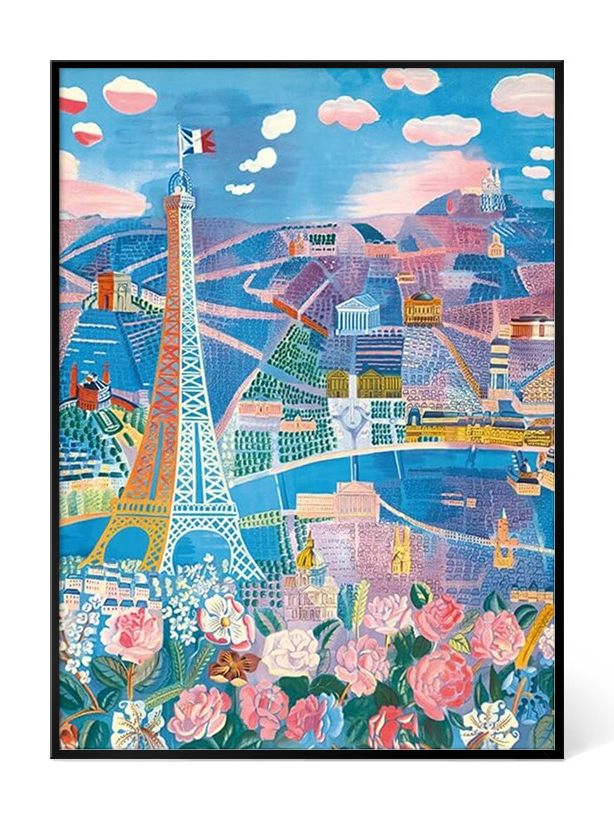 라울 뒤피의 대표작 <파리 꽃 박람회(The Paris Flower Show)>는 그가 사랑한 도시, 파리를 한 폭의 화려한 축제처럼 그려낸 작품입니다. 화면 중앙의 에펠탑을 필두로 개선문, 판테온, 사크레쾨르 대성당 등 파리의 상징적인 건축물들이 자유로운 원근법 속에 마치 춤을 추듯 배치되어 있습니다. 화면 하단을 가득 채운 화사한 장미와 수놓아진 꽃들은 도시 전체를 하나의 거대한 정원으로 탈바꿈시킵니다. 청량한 블루와 사랑스러운 핑크, 그리고 생기 넘치는 옐로우가 어우러진 이 포스터는 당신의 공간에 파리의 어느 화창한 봄날을 선물합니다.