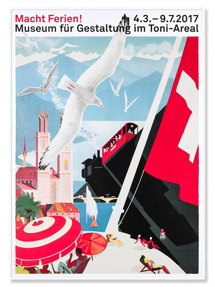 Make holiday!를 의미하는 <Macht Ferien!> 스위스 그래픽 디자인 포스터입니다.